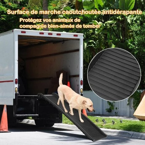 Votre chien a des soucis pour descendre de votre voiture ? Est-ce qu’il a peur de grimper les escaliers ? Cette rampe pour animaux de compagnie est la solution qu’il vous faut ! Sa conception pliable la rend facile à stocker et à porter, quand vous sortez vous pouvez facilement l’emmener dans le coffre de votre voiture. La surface antidérapante avec sa haute traction assure la sécurité de vos animaux, donc vous pouvez atteindre un endroit raide facilement. La rampe est fabriquée en matériaux PP durable et pèse seulement 4,16kg, mais elle peut facilement supporter 75kg. Equipé avec un loquet de sécurité, notre rampe pliable pour chien peut réduire les risques de chute.Caractéristiques :