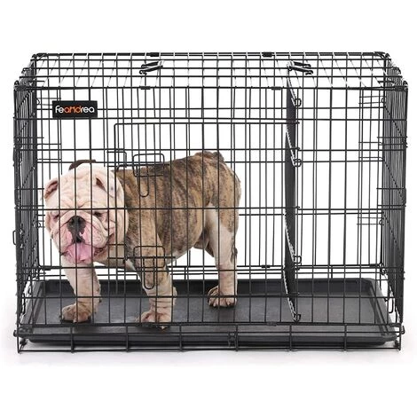 Facile à plier et à déplierGrâce à sa conception astucieuse, vous pouvez installer cette cage en quelques étapes, sans outils ! Pliez la cage pour gagner de la place en ca de non utilisation ou transport. | Cloison de séparationAvec la cloison réglable, vous pouvez ajuster l’espace dans la cage aux besoins de votre chien. Votre animal peut dormir d’un côté et manger de l’autre. Plus votre chien grandit, plus vous pouvez déplacer la cloison pour donner plus d’espace à votre animal. | Facile à déplacer sans rayer le solLa cage est munie de 8 protections de plancher en plastique qui facilitent le déplacement de la cage sans rayer votre plancher. | 2 portes et 4 loquets en LLa porte avant et la porte latérale permettent un accès facile pour votre chien et un nettoyage facile de la cage. Les loquets en forme de L le verrouillent solidement. |