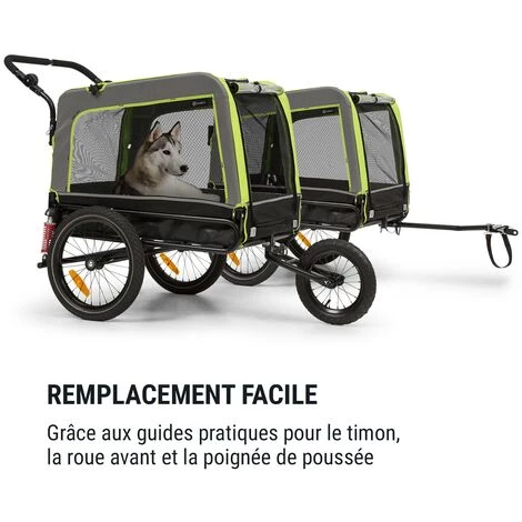 Comme son nom le suggère déjà, la remorque et poussette pour chien 2 en 1 Klarfit Husky Vario vous convaincra dans deux domaines : remorque pour vélo d’un côté, avec son timon de 75 cm de longueur et attelage prémonté qui s’attache facilement et rapidement à la roue arrière du vélo, elle s’utilise aussi comme poussette pour les promenades en jogging ou les grandes randonnées. Ici, le timon laisse la place à une roue avant facile à monter, tandis qu’une poignée de poussée réglable en hauteur se monte sur deux inserts à l’arrière. Si toutefois vous n’avez pas besoin de votre remorque professionnelle, les deux roues arrière se retirent en un rien de temps grâce au levier de pression qui verrouille et replie la remorque en quelques étapes simples.