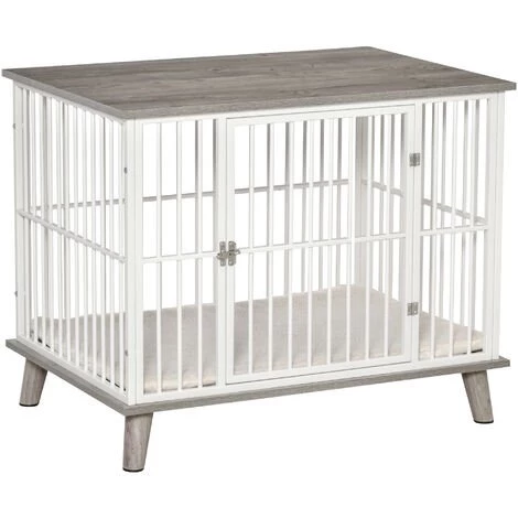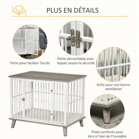 Cette superbe cage pour chien sur pied en acier blanc et panneaux de particules aspect bois gris vous permettra de mêler l’utile à l’agréable ! Votre chien sera confortablement installé (cage grande taille, coussin peluche courte et douce inclus, porte verrouillable) et vous disposerez d’un nouvel espace de décoration et rangement grâce à son plateau aspect bois.