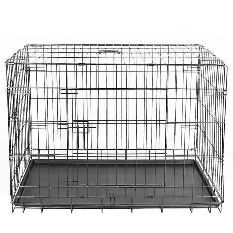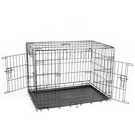 Cage Caisse Box de Transport pour Chien en Acier Pliable Noir. • Vous êtes à la recherche d’une caisse à la fois confortable et sécurisante pour votre animal ? Optez alors pour notre cage pour chien polyvalente. • Le box grillagé est prêt à l’emploi en quelques gestes et peut être replié, ce qui représente un vrai gain de place ! • Les deux grandes portes à l’avant et sur le côté permettent à votre animal de compagnie d’entrer et de sortir facilement du box. • La cage peut être également utilisée comme parc à chiots. • Le bac de sol en plastique est amovible, et est facilement nettoyable. • Les coins arrondis sont conçus pour garantir un transport de votre animal sans blessures. • Les barreaux métalliques sont robustes et l’espace entre ceux-ci permet à votre animal de profiter de la visibilité et de l’air frais. • Que ce soit dans la voiture ou à la maison : la cage pliable pour chien est optimale non seulement pour le transport mais aussi comm lit.transports: la cage pliable pour chien est optimale pour votre animal.