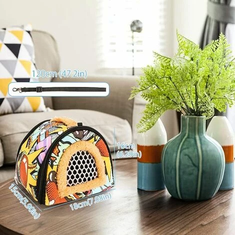 【2 modes de transport】 Le porte-hamster est équipé d’une bandoulière et d’une ceinture de transport, vous pouvez donc choisir un moyen plus confortable de le porter. Soutenez le portage à la main et le port de la sangle, utilisez la bande en peluche jaune